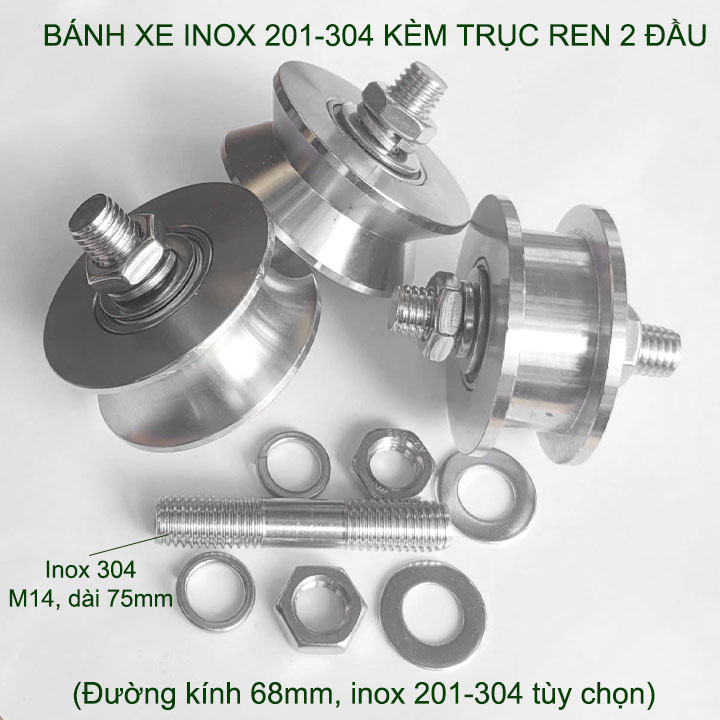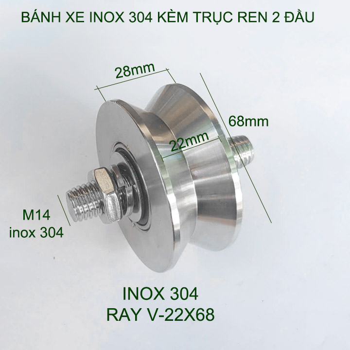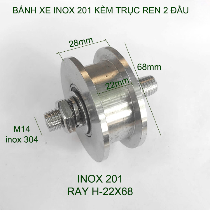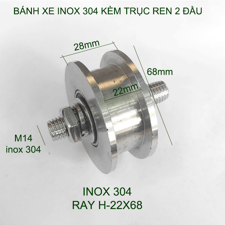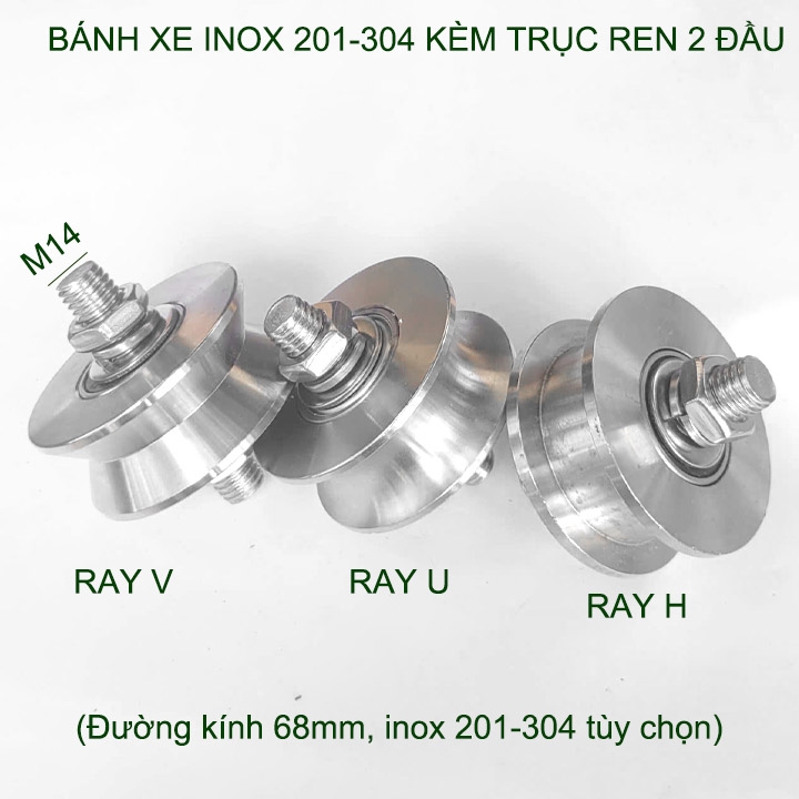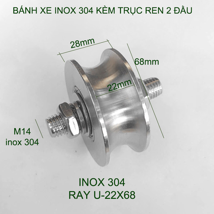 01 Bánh xe cho cửa cổng trượt, cửa lùa kèm trục ren 2 đầu, bằng inox 201-304, loại 22x68mm, Hình U, V, H tùy chọn