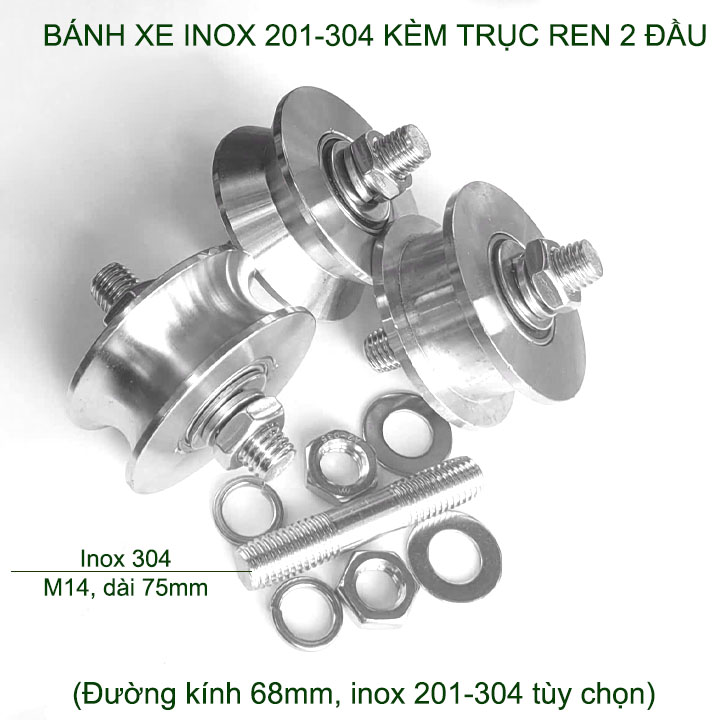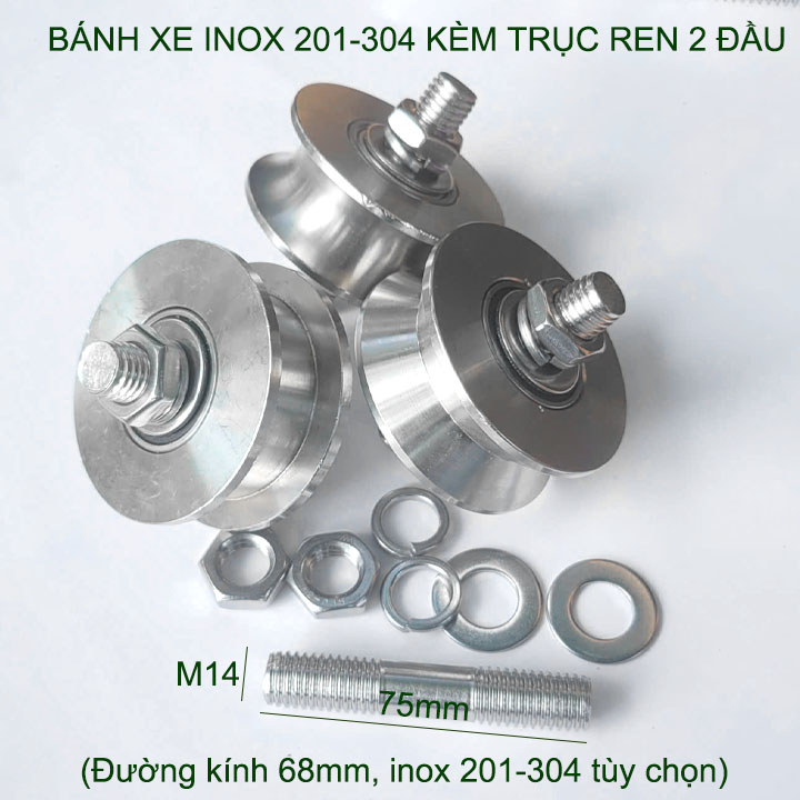 01 Bánh xe kèm trục ren 2 đầu cho cửa cổng trượt được thiết kế đơn giản với vật liệu inox 201-304 nguyên khối, không gỉ, chắc chắn, rất bền. Kích thước bánh Puly trong lòng rộng 22mm, đường kính 68mm