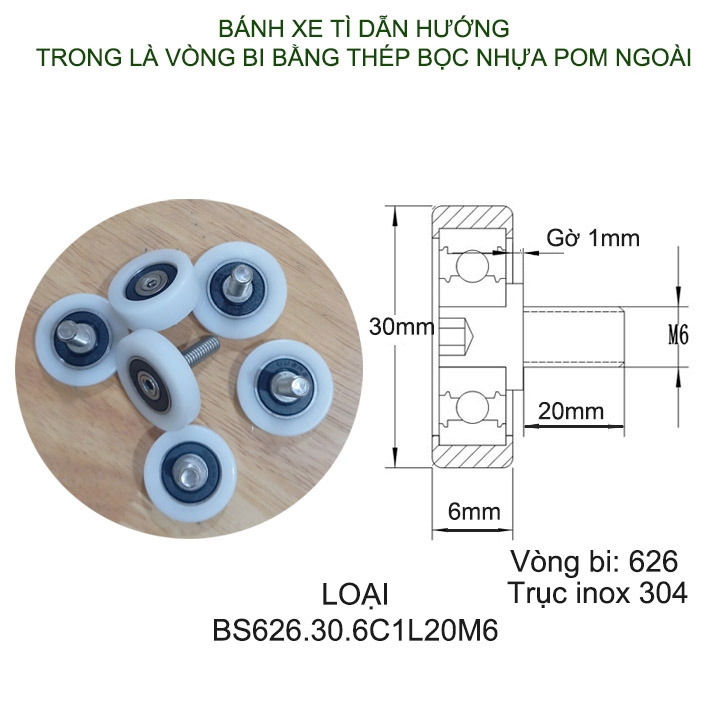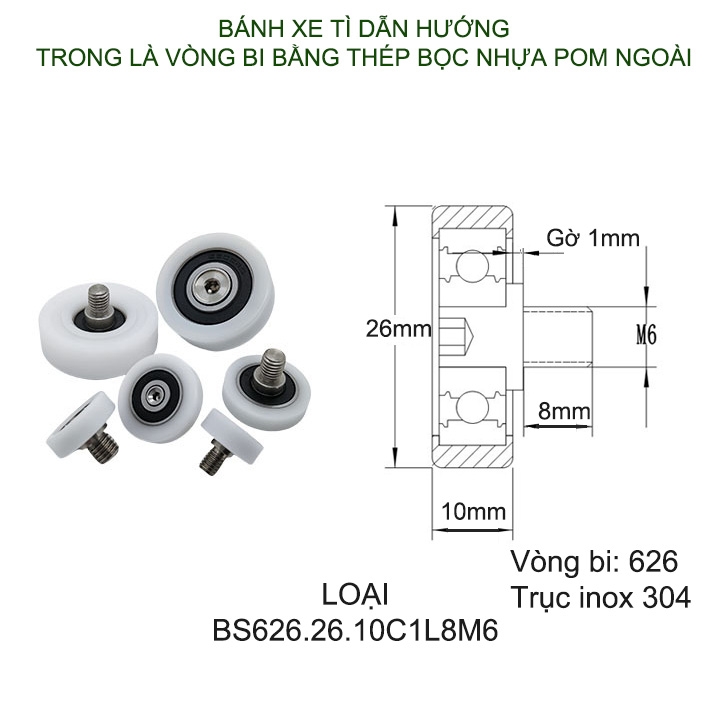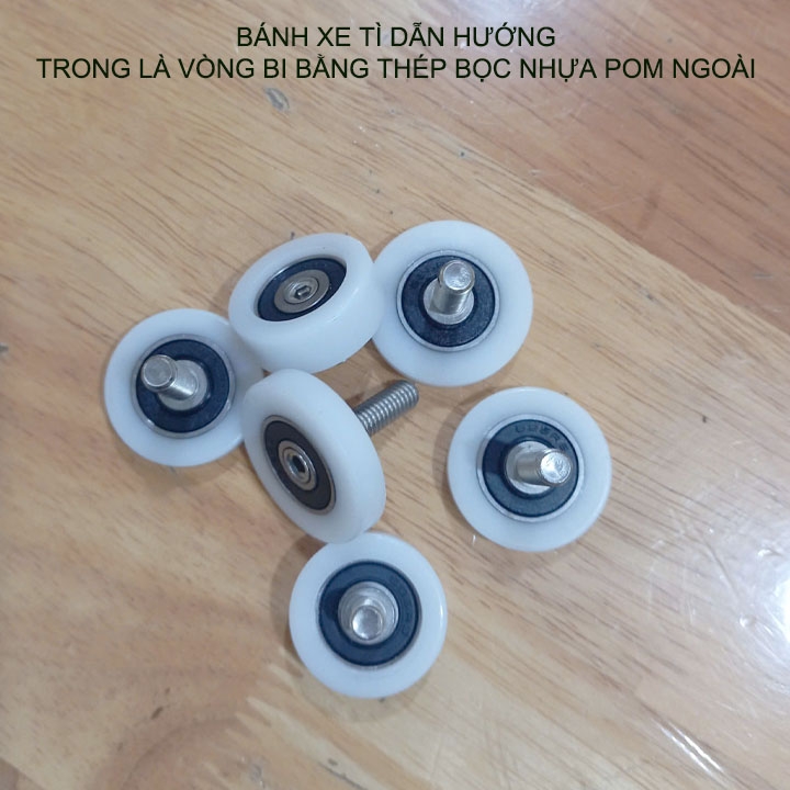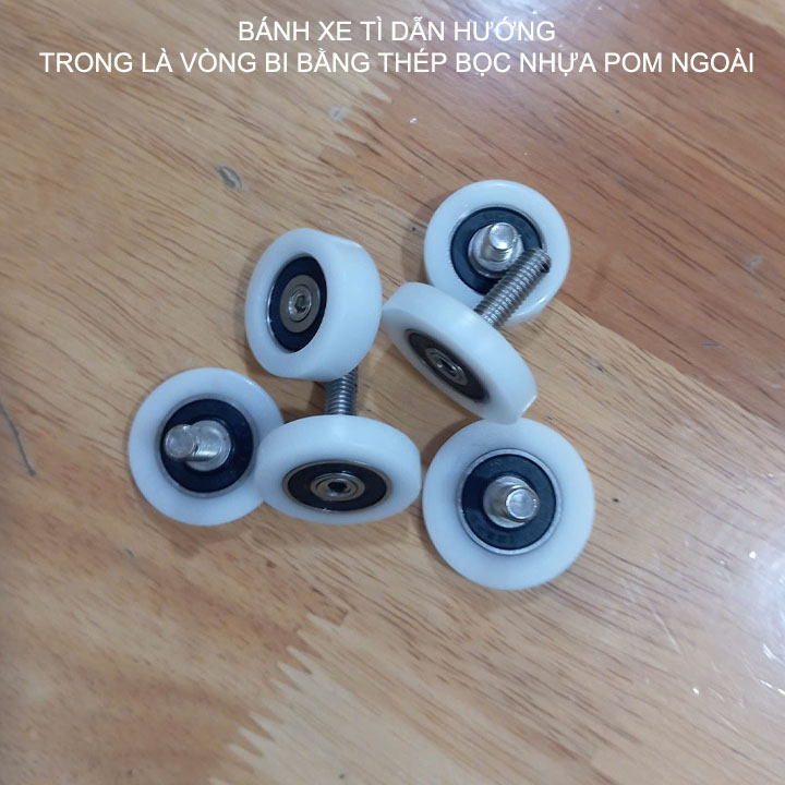Bánh xe tì dẫn hướng được thiết kế nhỏ gọn, chắc chắn với bên trong vòng bi bằng thép được bọc ngoài bằng nhựa cứng POM chịu mài mòn rất bền, trục ren bằng inox 304 rất bền, chuyên dùng cho việc lắp đặt và thay thế các bánh xe cửa trượt