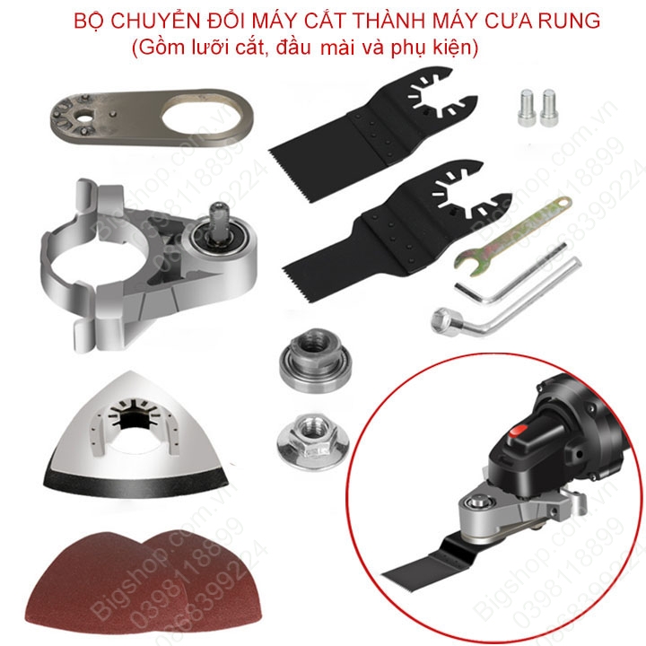 Bộ chuyển đổi máy cắt cầm tay thành máy cắt rung đa năng, kèm 2 lưỡi cắt 1 đầu mài và phụ kiện (Trục D10mm)