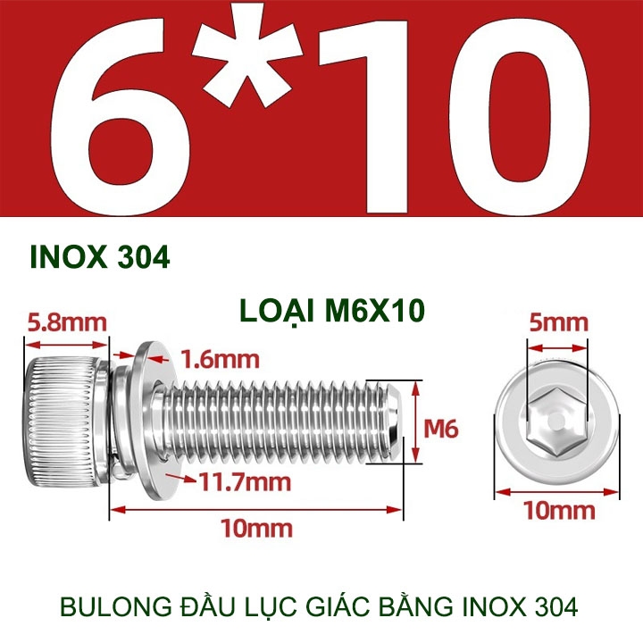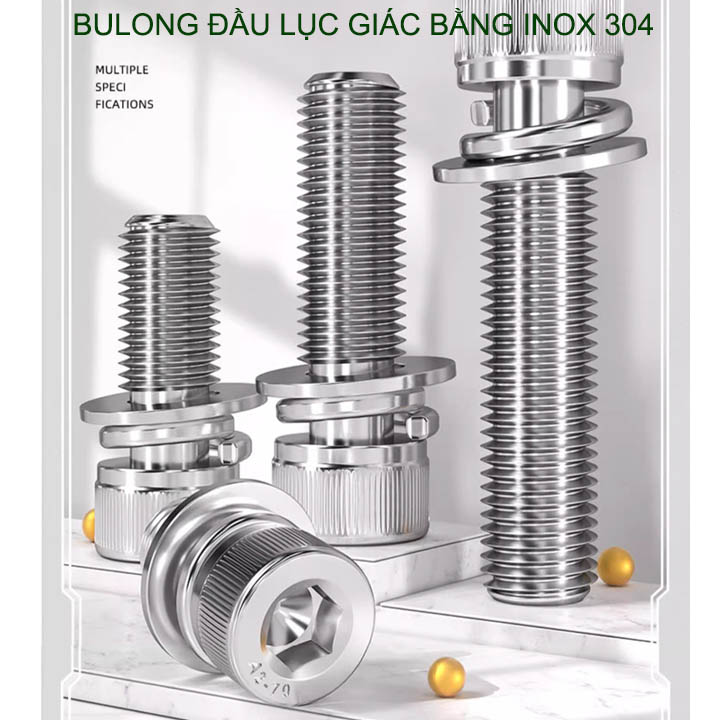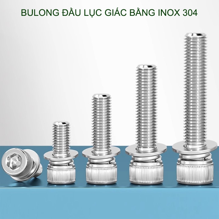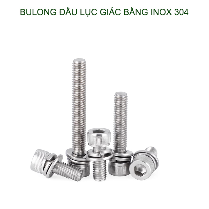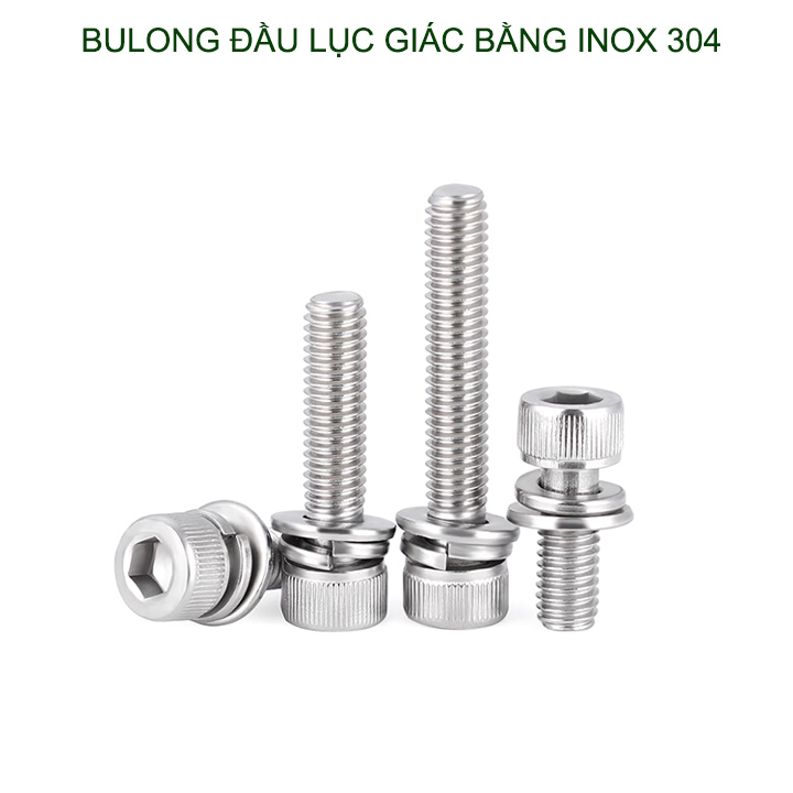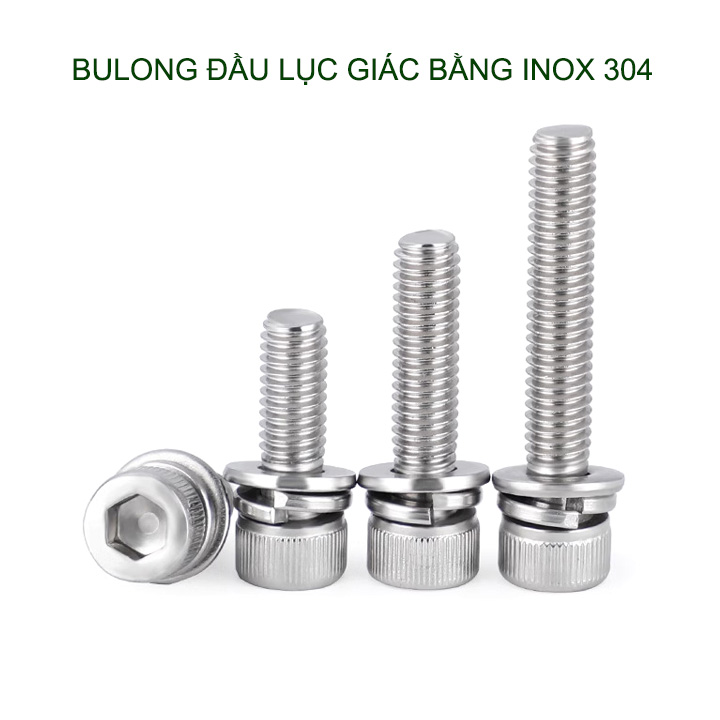 Combo 2-10 bulong đầu lục giác chìm bằng inox 304, có kèm long đen phẳng và kênh M4-M6-M8-M10 tùy chọn