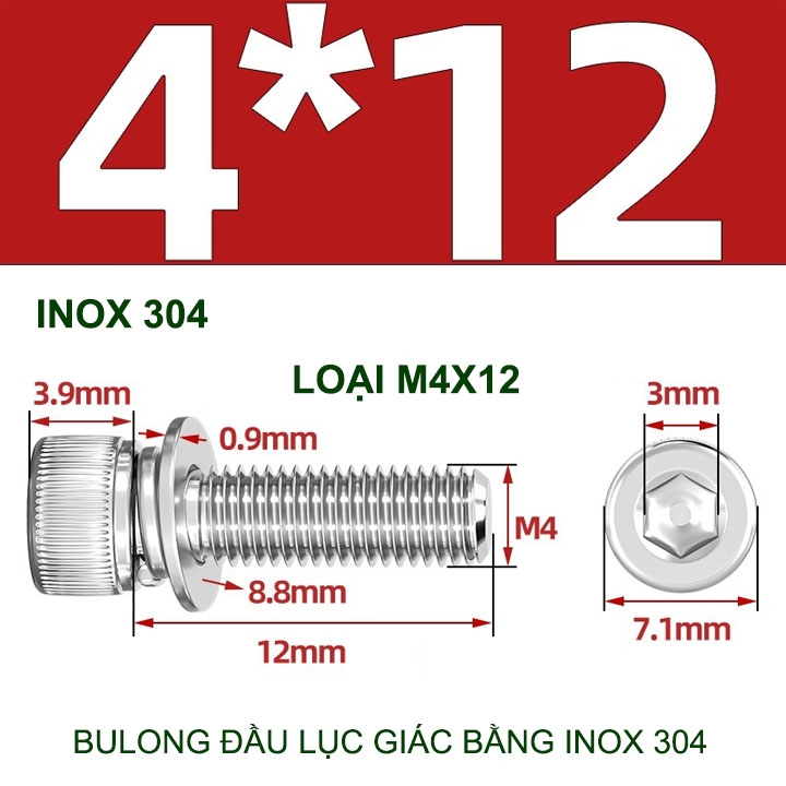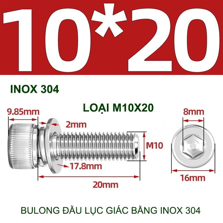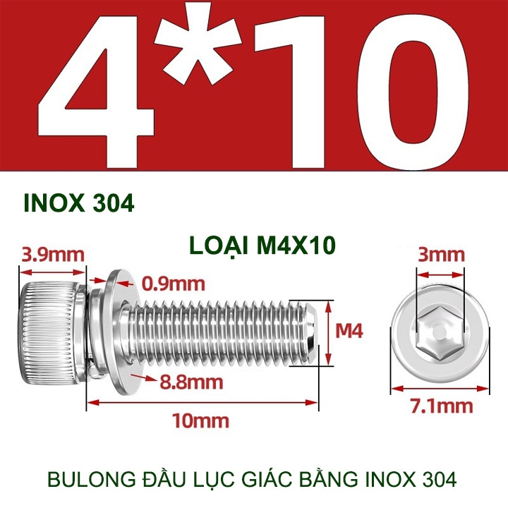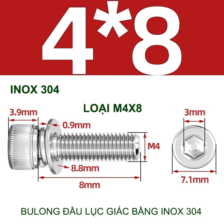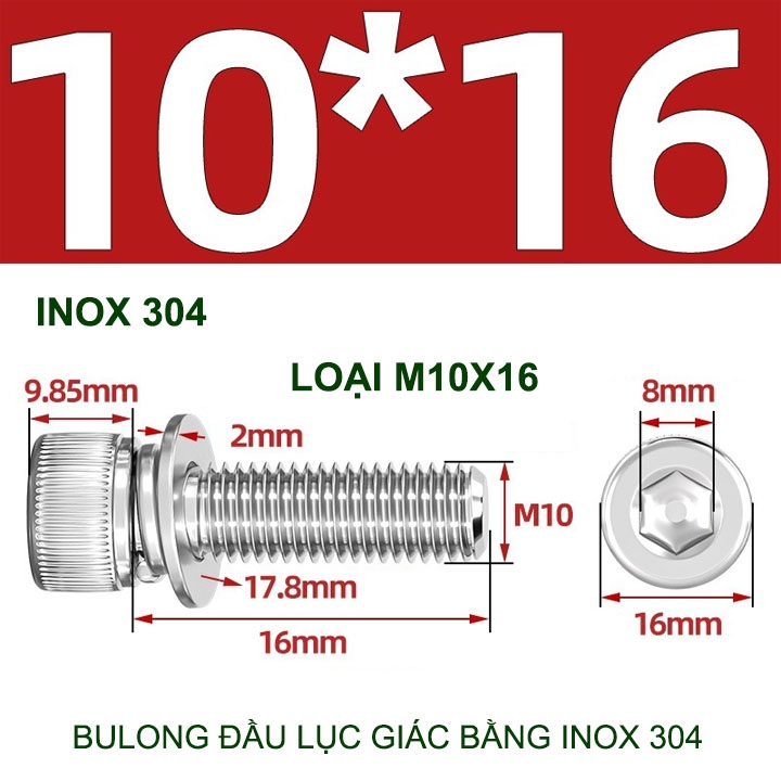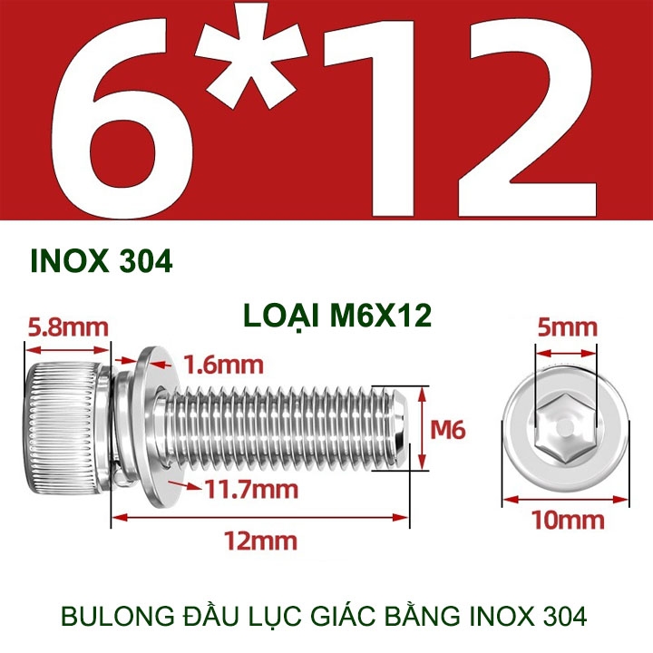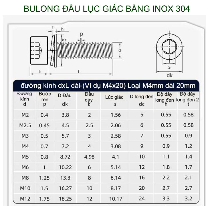 Combo 2-10 bulong đầu lục giác chìm bằng inox 304, có kèm long đen phẳng và kênh M4-M6-M8-M10 tùy chọn